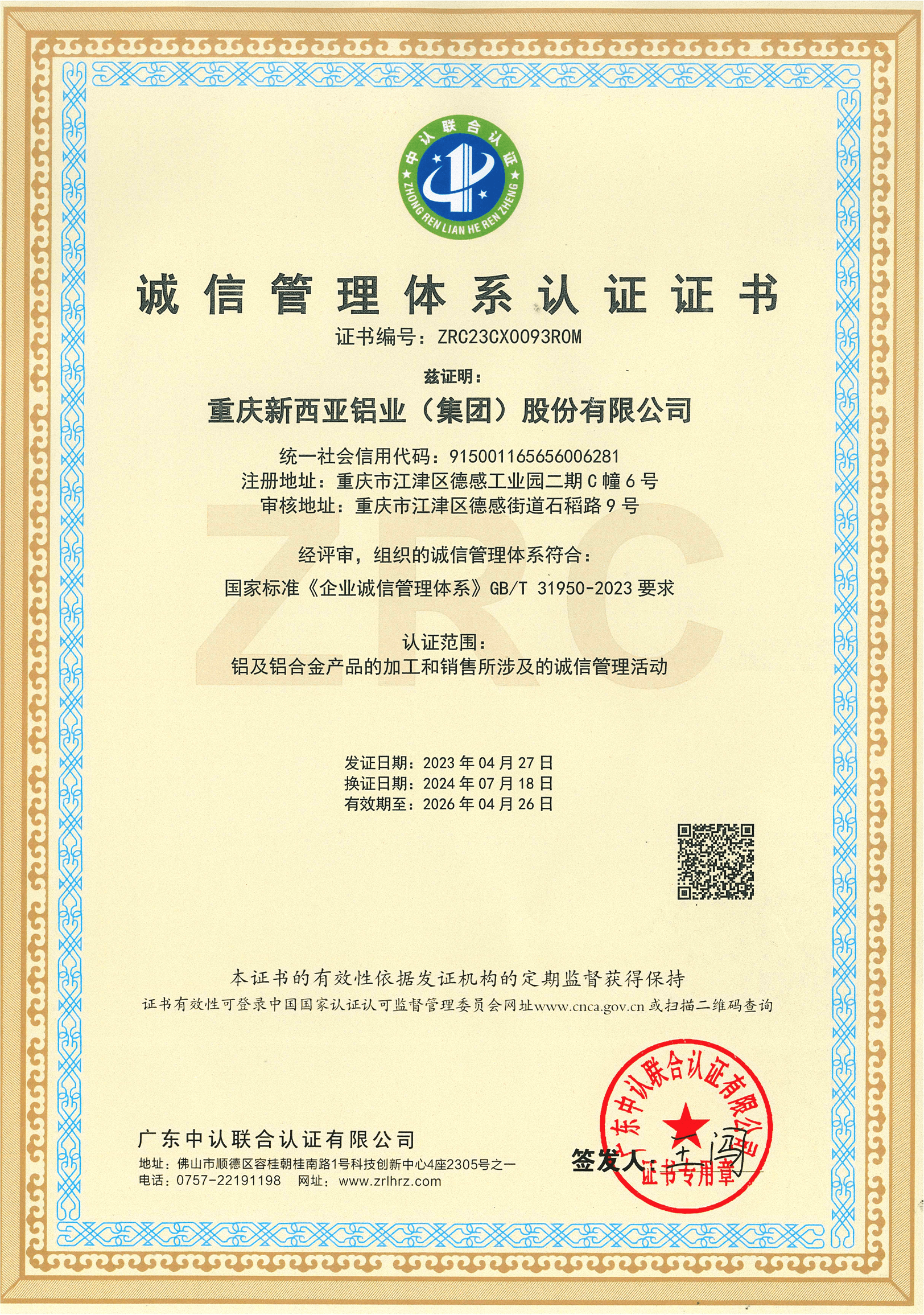 誠信管理體系認證證書