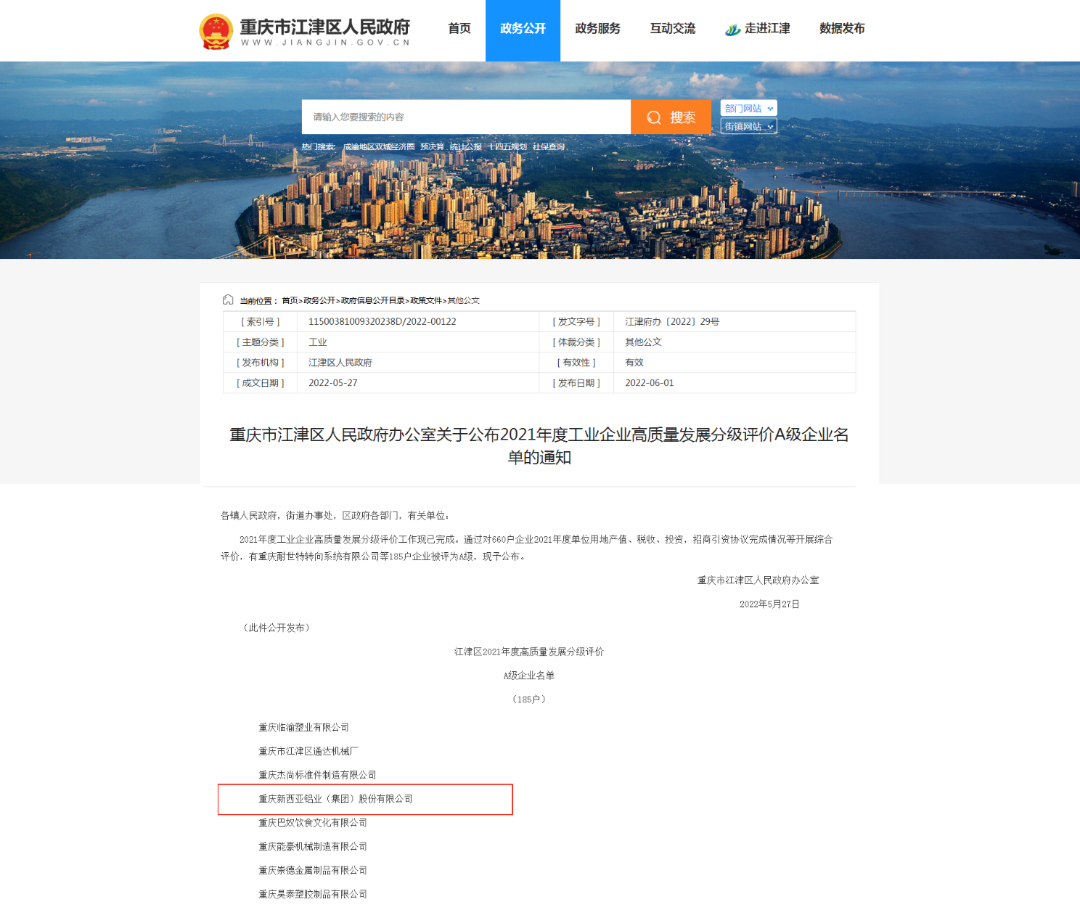 重慶新西亞鋁業(yè)(集團)榮獲“2021年度工業(yè)企業(yè)高質(zhì)量發(fā)展分級評價A級企業(yè)”。